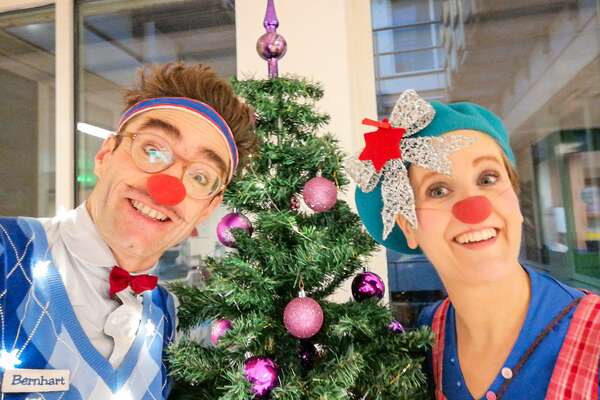 Clown Harald und Clownin Mathilde zaubern weihnachtliche Stimmung ins Pflegewohnhaus Simmering in Wien.