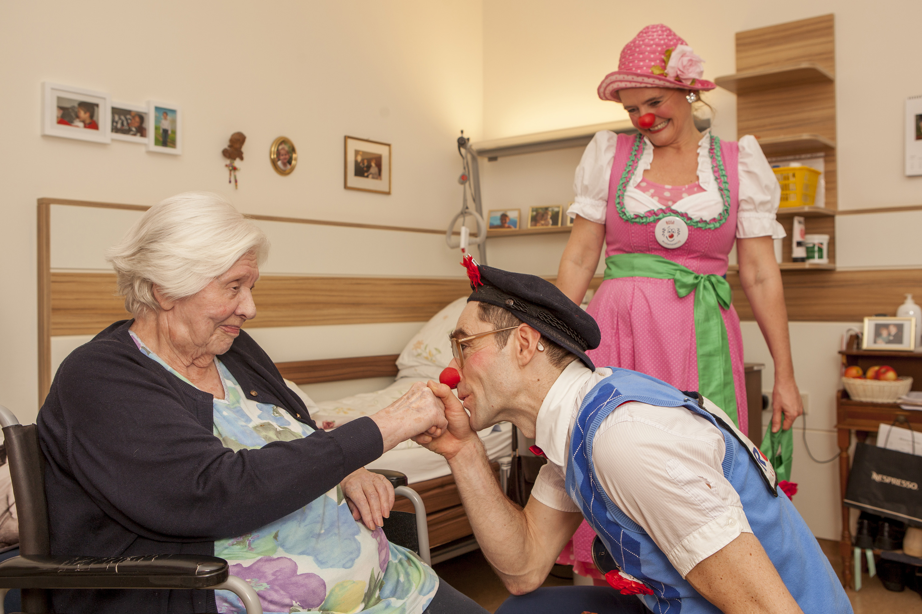 Für das Clown-Sein im stationären Pflegebereich braucht es eine große Liebe zu dieser Aufgabe. Es geht darum, dass man auch mit einem alten Menschen, dem die Zahnprothese aus dem Mund rutscht, und der bei jedem Besuch immer wieder dieselben Geschichten aus seinem Leben erzählt, seinen Spaß finden kann und Lust auf gemeinsames „Blödeln“ entwickelt. Ältere Menschen sind oft nicht mehr bereit sich gesellschaftlichen Konventionen unterzuordnen, sie spüren wie jemand mit ihnen in Kontakt tritt und wenn das Interesse nicht ehrlich gemeint ist, dann reagieren sie sofort darauf.