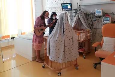 “Die kleinen Babys in den Inkubatoren mögen schöne Töne und sanfte Melodien, die wir auf unseren Instrumenten spielen. Wenn ich mein kleines Daumenklavier auf den Inkubator lege und leise Musik spiele, sehe ich an den Monitoren, wie sich der Puls des Babys senkt und es sich entspannt. Manchmal nehme ich auch einen aufgeblasenen Luftballon mit. Wenn ich diesen auf den Inkubator setze, meinen Mund auflege und hindurch spreche oder singe, erinnert es das Baby an die gedämpften Geräusche im Mutterbauch. Das hat auch einen sehr beruhigenden Effekt.”