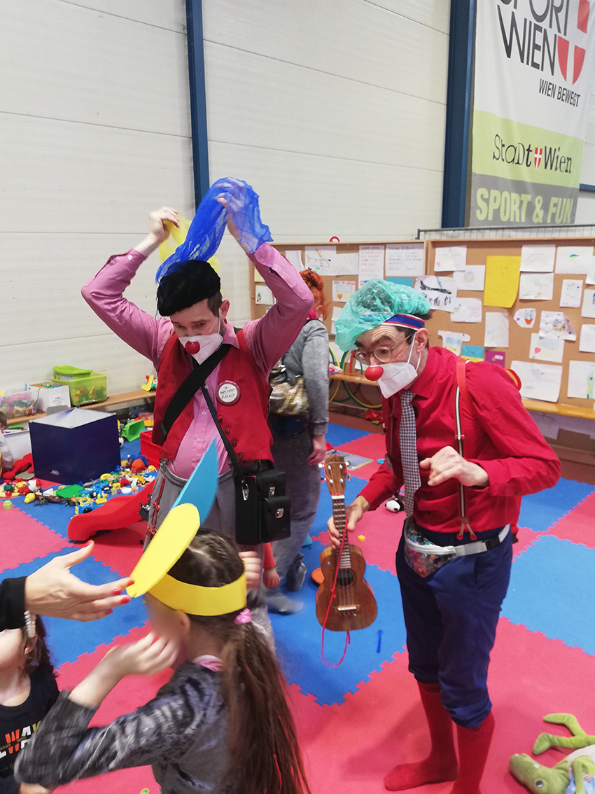 Wir waren auch in der Kinderspielecke, wo wir den meisten Kindern begegnet sind. Dort kam ein zweijähriges Mädchen auf mich zu und deutet auf meine Ukulele. Ich begann ein sanftes, verträumtes Lied zu spielen. Das Mädchen hatte eine elektrische Zahnbürste in der Hand. Während also Clown Bernhart das Lied spielt, nähert sie sich mit dieser Zahnbürste und dreht sie auf! Das war für den ängstlichen Bernhart zu viel, woraufhin sie meinen Clownkollegen und mich damit verfolgt hat. Das ist das Allerschönste für uns, wenn nicht wir für die Kinder etwas spielen, sondern sie das Spiel bestimmen und Teil des Spiels sind. Dieses so genannte „Empowerment“ ist sowohl bei diesen Emergency Smile Einsätzen als auch in der Kinderpsychiatrie so wichtig: Auf einmal führen die Kinder Regie oder dürfen uns herumkommandieren. Sie treten aus dieser Machtlosigkeit heraus und haben wieder das Sagen. Für uns Clowns ist es ein gelungenes Spiel, wenn die Kinder die Helden sind und auf einer hohen Stufe stehen können.