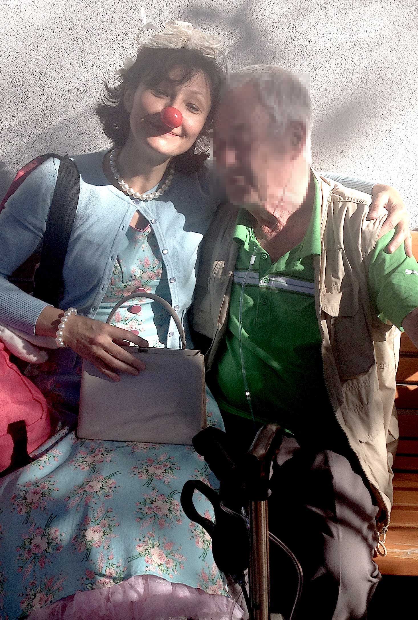 Aufmerksam beobachtend, gehen Brösel und Flora durch die Stationen. Werden die Clowns auch bei älteren Erwachsenen gut ankommen? Brösel spielt auf seiner Ukulele „Veronika, der Lenz ist da“ und Flora singt dazu. Die Patienten, die an Tischen in Aufenthaltsräumen sitzen, blicken auf, lächeln, manche singen mit. Das Eis ist schnell gebrochen. Mit großem Hallo stellen sich Flora und Brösel vor und schütteln viele Hände. Es ist ein schöner, erster Empfang – und der Beginn einer langen, schönen Zusammenarbeit in der Albert-Schweitzer-Klinik.