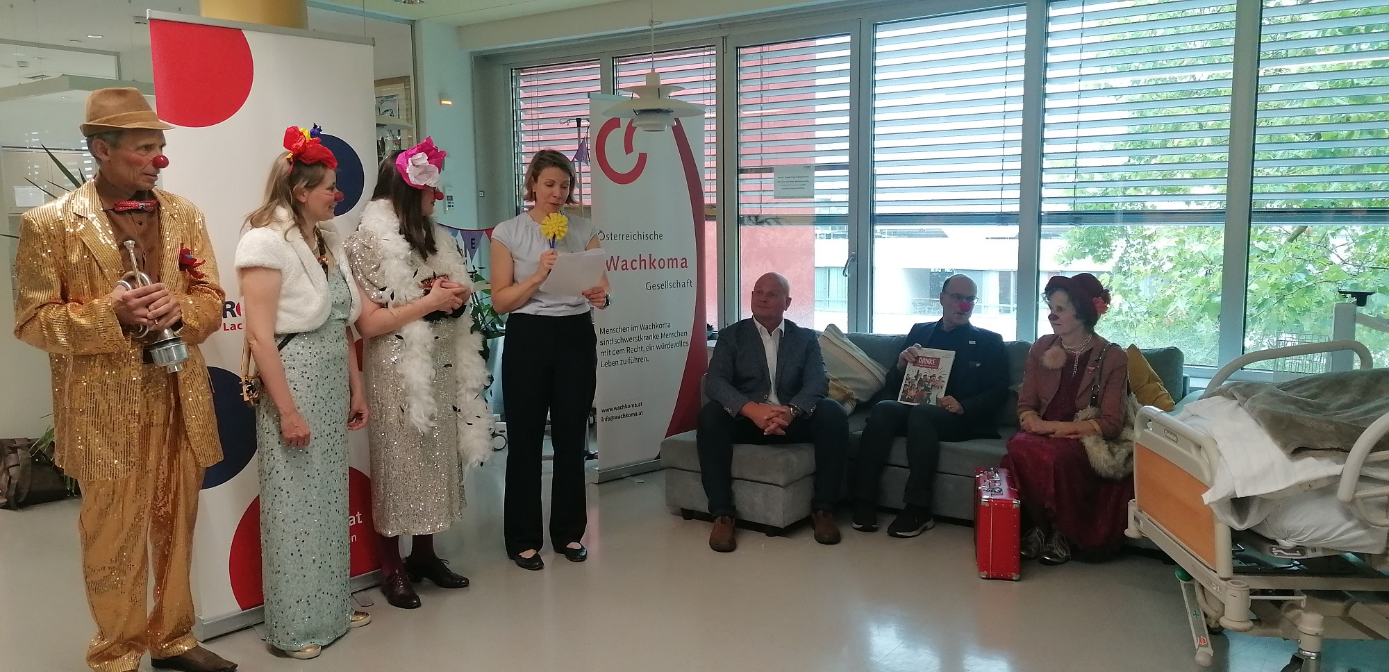 Im Zuge der Jubiläumsfeier zeichnete ROTE NASEN das Wachkoma-Department als Paradebeispiel für eine langjährige, wertschätzende und professionelle Zusammenarbeit und die hervorragende Integration von ROTE NASEN Clowns in den Stationsalltag aus.