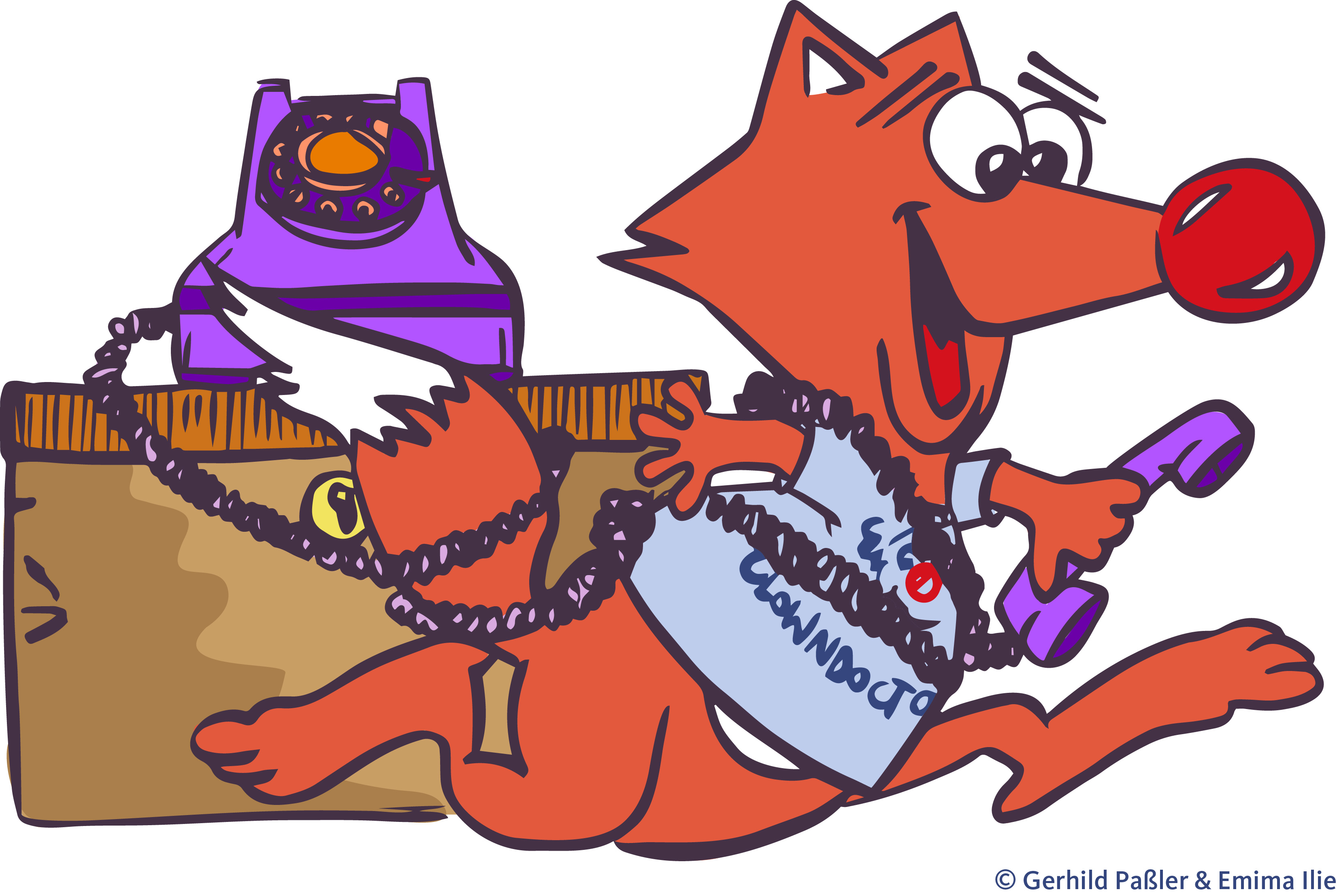 Siehe da, keine drei Stunden später läutete schon das Telefon, ich flitzte hin und der erste Bewerber meldet sich mit: „Guten Tag, ich bin der Wolf Hans-Peter, habe ein eigenes Café und würde Aloisia gerne zu mir zu Kuchen und Kaffee einladen. Ich hole sie natürlich auch ab.“ Um ja sicher zu gehen, dass dieser Wolf keine falschen Absichten hatte – in irgendeinem Märchen hat ja bekanntlich so ein Wolf-Vieh eine Großmutter gefressen – befragten unser Hauskater und ich den Wolf Hans-Peter ganz genau. Sein Bruder war Konditor, daher hatte er stets ganz viele, frische Mehlspeisen in seinem Café: Sachertorte, Malakovtorte, Linzer Schnitten, Topfengolatschen, Punschkrapferl, Nusshörnchen… Bei dieser Aufzählung lief mir das Wasser im Clown-Fux-Mund zusammen. So viiieeele guuute Mehlspeisen! Was aber würde passieren, wenn Aloisia all diese Mehlspeisen aufessen würde? „Dann nimmt sie wahrscheinlich Unmengen zu und kann noch länger nicht ordentlich laufen“, analysierte unser Hauskater. „Das kann ich mit meiner Clown-Fux-Ehre nicht zulassen“, sprach ich wie ein mutiger Ritter und stieg statt Aloisia zu Hans-Peter ins Auto, um im Café 16 Stück Torte, 23 Kleingebäcksorten und mindestens 56 Kekse zu essen. Nur so konnte ich Aloisia helfen.