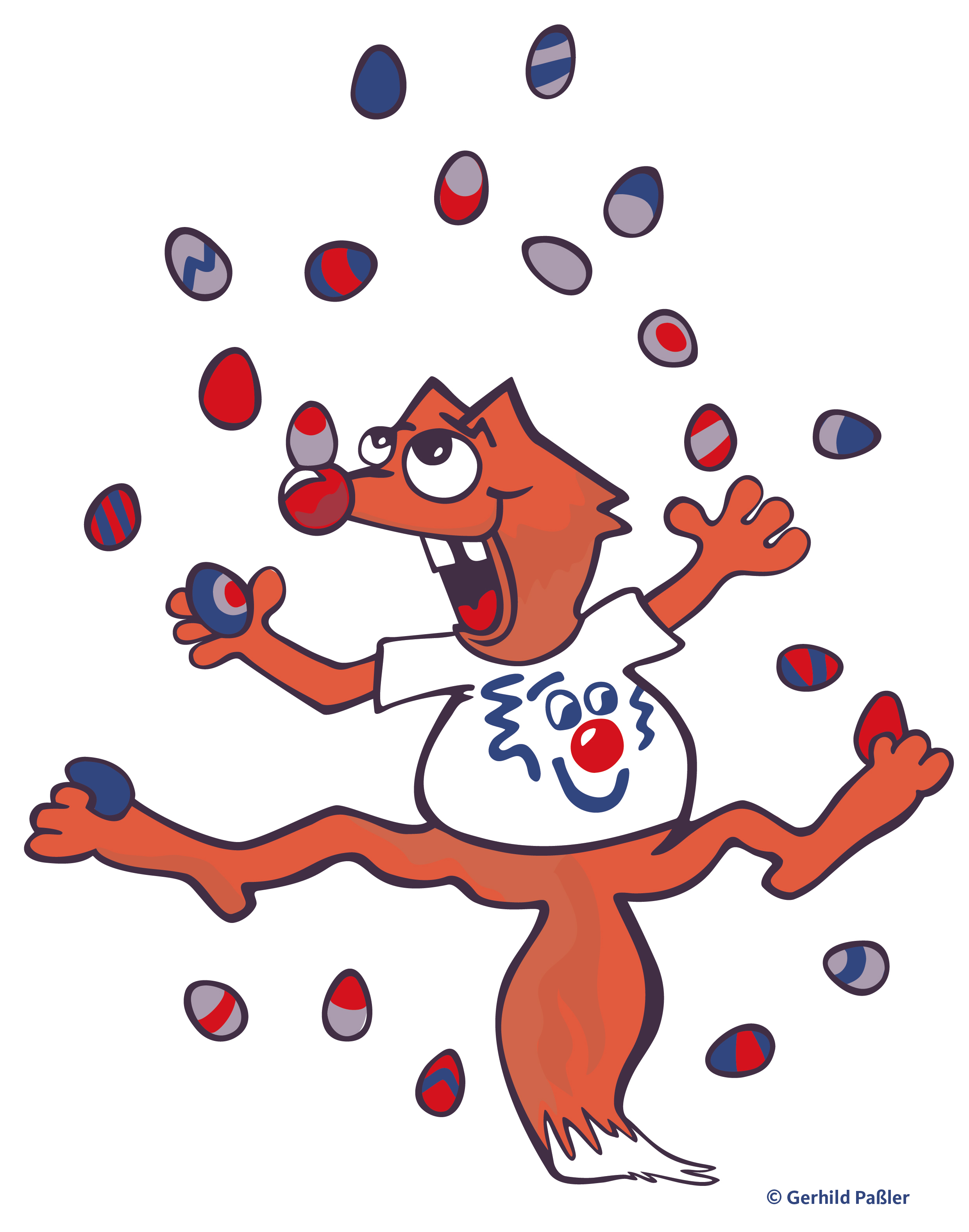 Aus diesem Grund binden wir uns alle drei eine Schürze um, suchen alle Eier zusammen, die wir finden können, kochen und färben sie dann. Der Osterhase holt sie schließlich heimlich in der Nacht ab und verteilt sie dann am Ostersonntag. Unser Hauskater und ich sind für das Einsammeln der Eier zuständig – das ist lustig! Wir flitzen so schnell wir können zuerst durch unser Haus, nehmen alles mit, was nach Eiern aussieht, um dann in Garten zu unseren Hühnern zu sausen und schließlich in die Nachbargärten. Letztes Jahr hatten wir 112 Stück, das war ein neuer Rekord, den wir heuer übertreffen wollen. Deshalb sammeln der Hauskater und ich schon seit Monaten, alles was irgendwie nach Ei aussieht und verstecken es einstweilen unter Aloisias Bett. Momentan sind in unserem Fundus 17 Eier, die vor Weihnachten gelegt wurden, ein paar Vogeleier von letztem Sommer, dann ungefähr zehn Eier, die wir in einem Blumengesteck fanden, das seltsamerweise niemals gegossen wurden, zwei Straußeneier, die irgendwie wie Fußbälle aussehen und ein goldenes Ei, das sogar tickt. Ich bin mir nicht ganz sicher, ob das ein echtes Ei ist, aber der Hauskater meint stets: „Ei ist Ei.“ Gut, dieses tickende Ei, das wir in Aloisias Schmuckschatulle gefunden haben, müssen wir wenigstens nicht mehr färben, das ist schon schön golden. Außerdem stibitze der Kater einige Sackerln Schokoeier aus Ritas Schokoladen-Lade. Rita ist übrigens auch eine Clownin, die eine eigene Lade für Schokolade hat, in der jetzt alle Schokoeier fehlen…