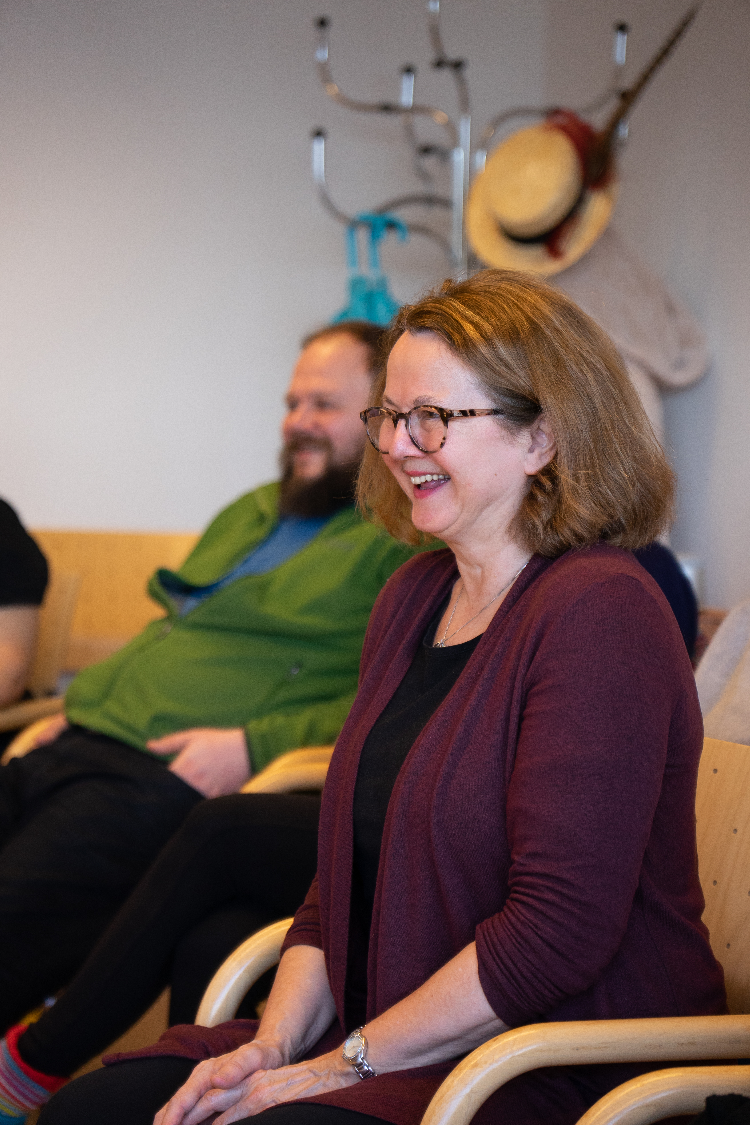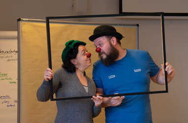 Angeleitet wurde die Übung von Magdalena Schamberger. Die gebürtige Österreicherin lebt in Schottland und hat sich dort als gefragte Spezialistin in der künstlerischen Arbeit mit Menschen mit Demenz etabliert. „Clowns sind Spezialisten für das Leben im Hier und Jetzt und das ist sehr wichtig bei Menschen mit Demenz. Ihnen bleibt trotz individueller Einschränkungen der Sinn für Kreativität, Rhythmus und Humor. Hier können die Clowns wunderbar anknüpfen. Durch die auffällige rote Nase werden die Menschen direkt zu den Augen der Clowns geleitet, wodurch eine menschliche Begegnung stattfinden kann. Clowns werden zu Verbündeten, die eine gewisse Zerbrechlichkeit mit ihnen teilen“, weiß Schamberger, die auch als Honorary Professor an der School of Health der Queen Margaret University in Edinburgh unterrichtet.