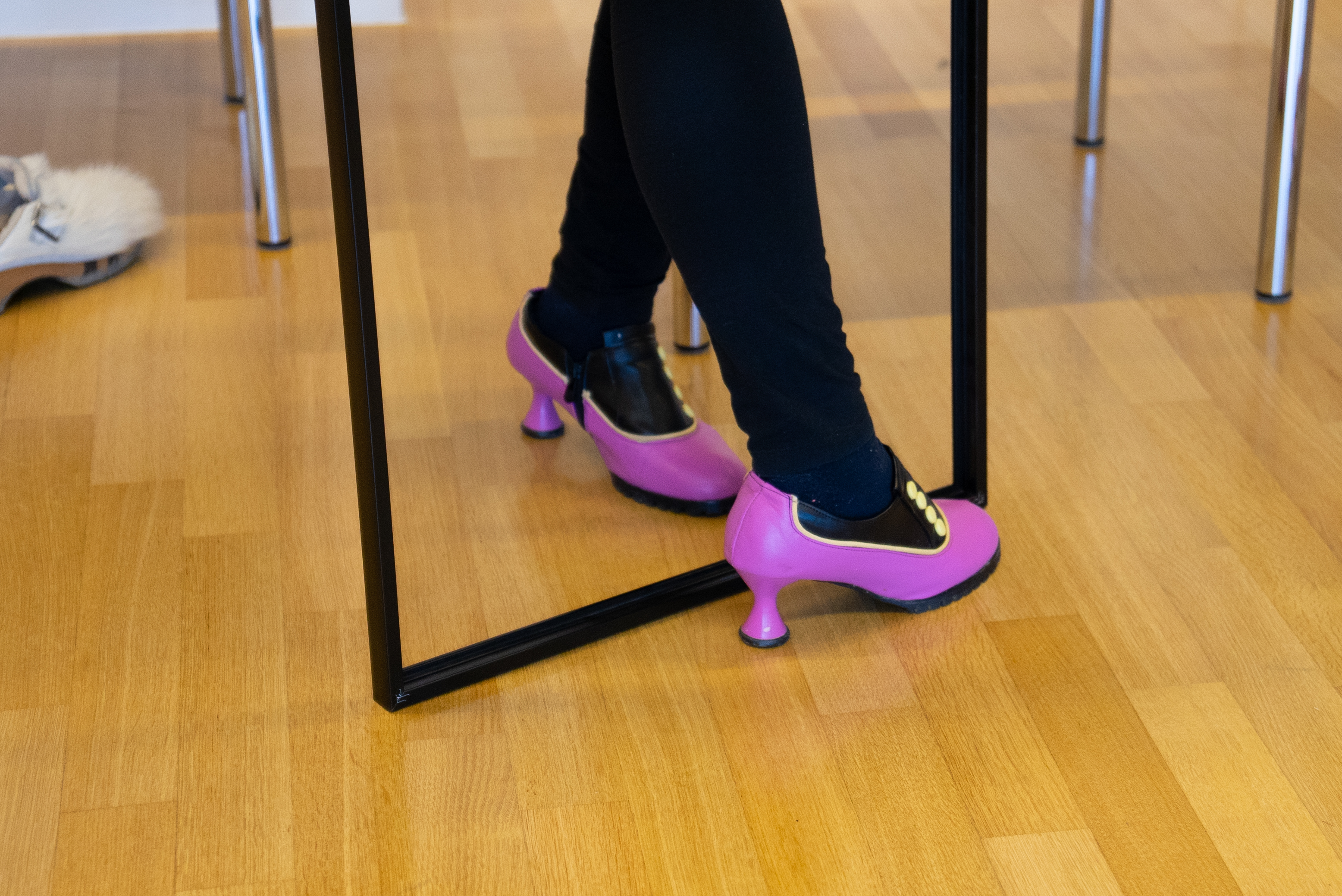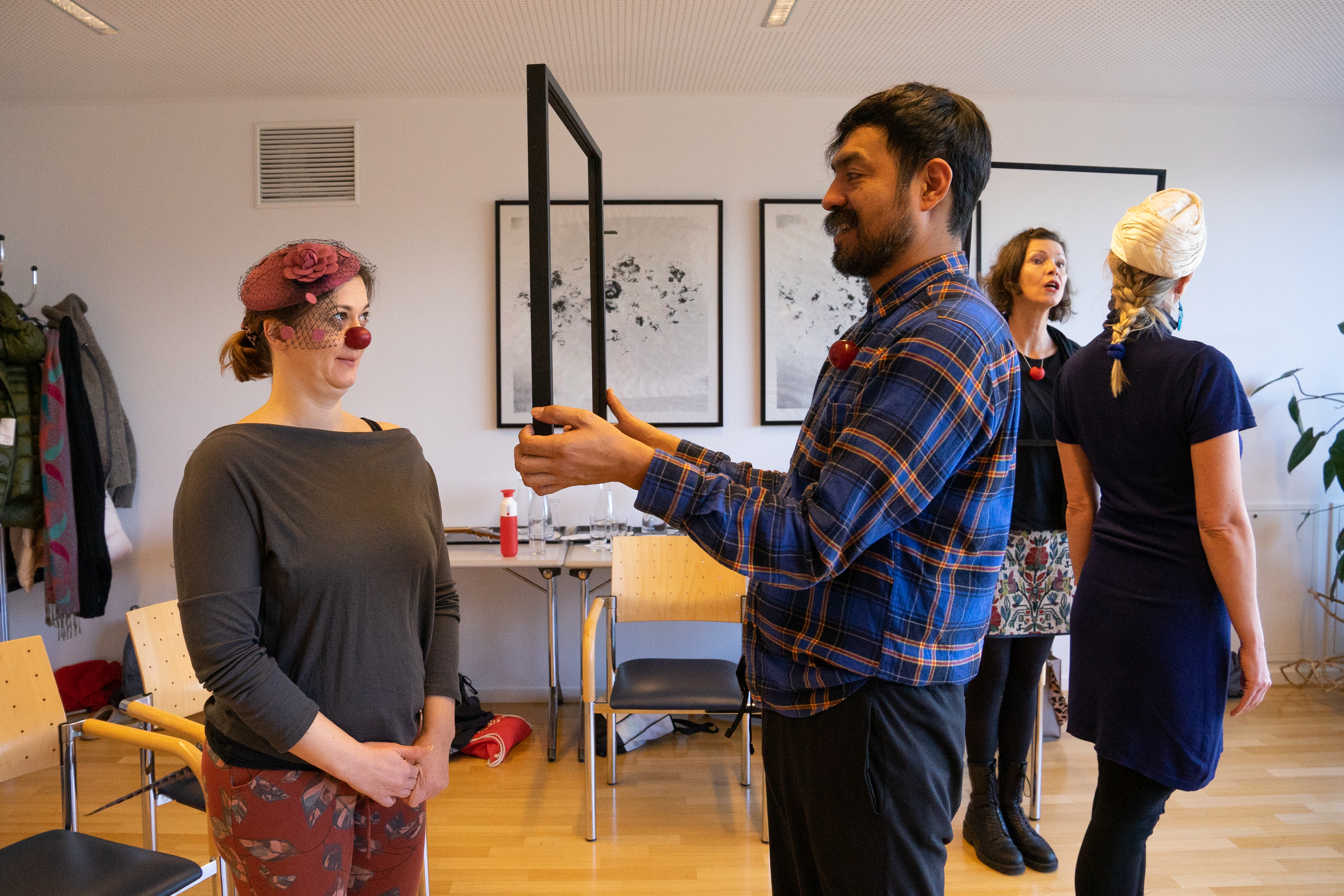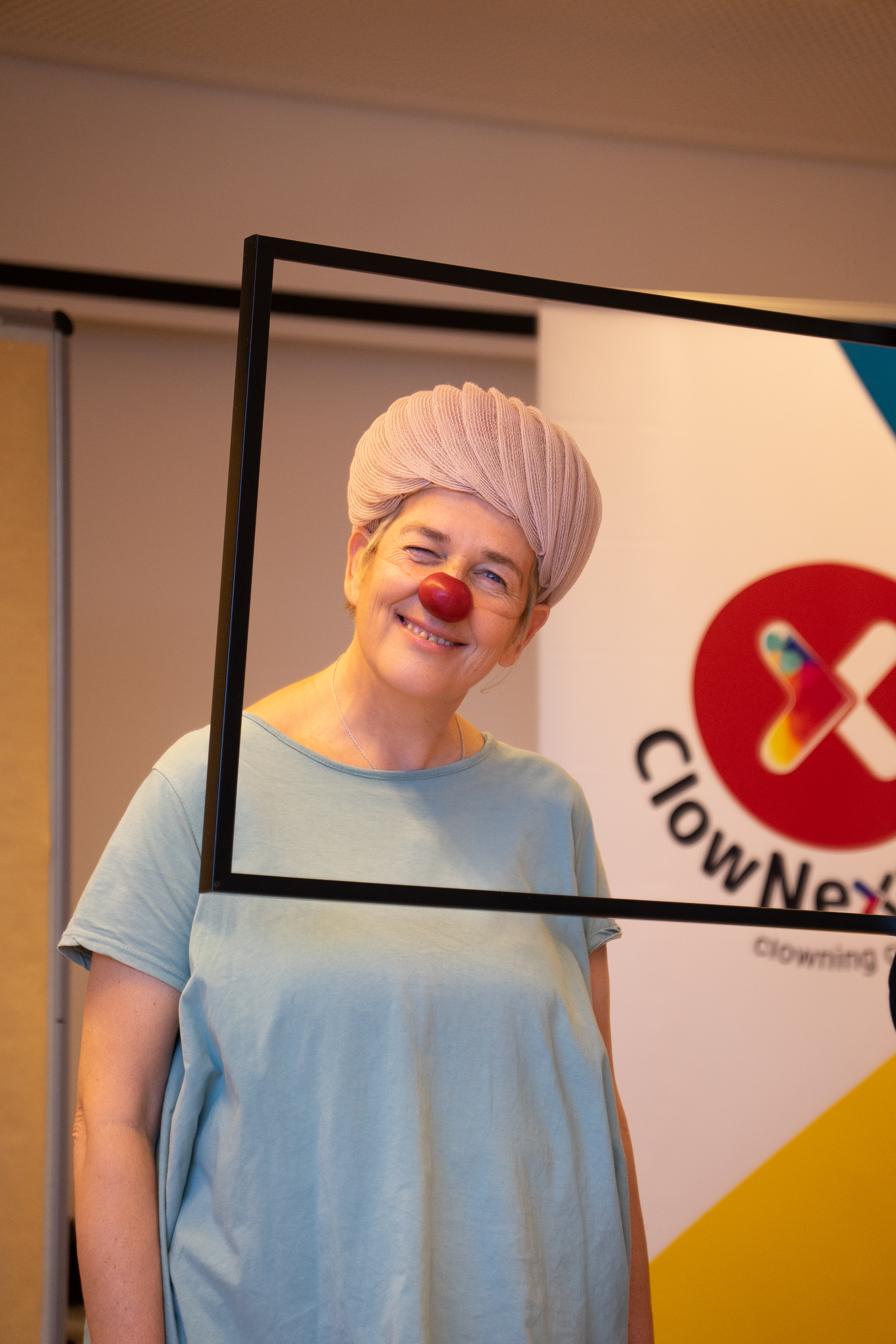 Dem Austausch mit Clowns aus den Partner-Organisationen der teilnehmenden Länder wird in ClowNexus ein hoher Stellenwert eingeräumt. Bei der dritten internationalen Forschungsklausur in Innsbruck zum Thema Demenz gab es dahingehend viel Raum für experimentelles Arbeiten. Da wurde etwa ein Bilderrahmen zur Begrenzung der „Bühne“. Christina Matuella, künstlerische Leiterin von ClowNexus in Österreich, erklärt warum: „Menschen mit Demenz blicken oft in gebückter Haltung vor sich auf den Boden. So sehen sie uns Clowns nie als ganzen Menschen, sondern immer nur Ausschnitte von uns – gerade so als würden sie durch einen Bilderrahmen blicken. Wir passen daher unser Clown-Spiel an, sodass wir in ihrem Blickfeld agieren. Wir setzen uns auf den Boden oder bewegen nur die Füße in einem sich wiederholenden Muster. Dieses Spiel in einem eingeschränkten Gesichtsfeld haben wir unter anderem in der Forschungsklausur in Innsbruck geprobt und vertieft.“