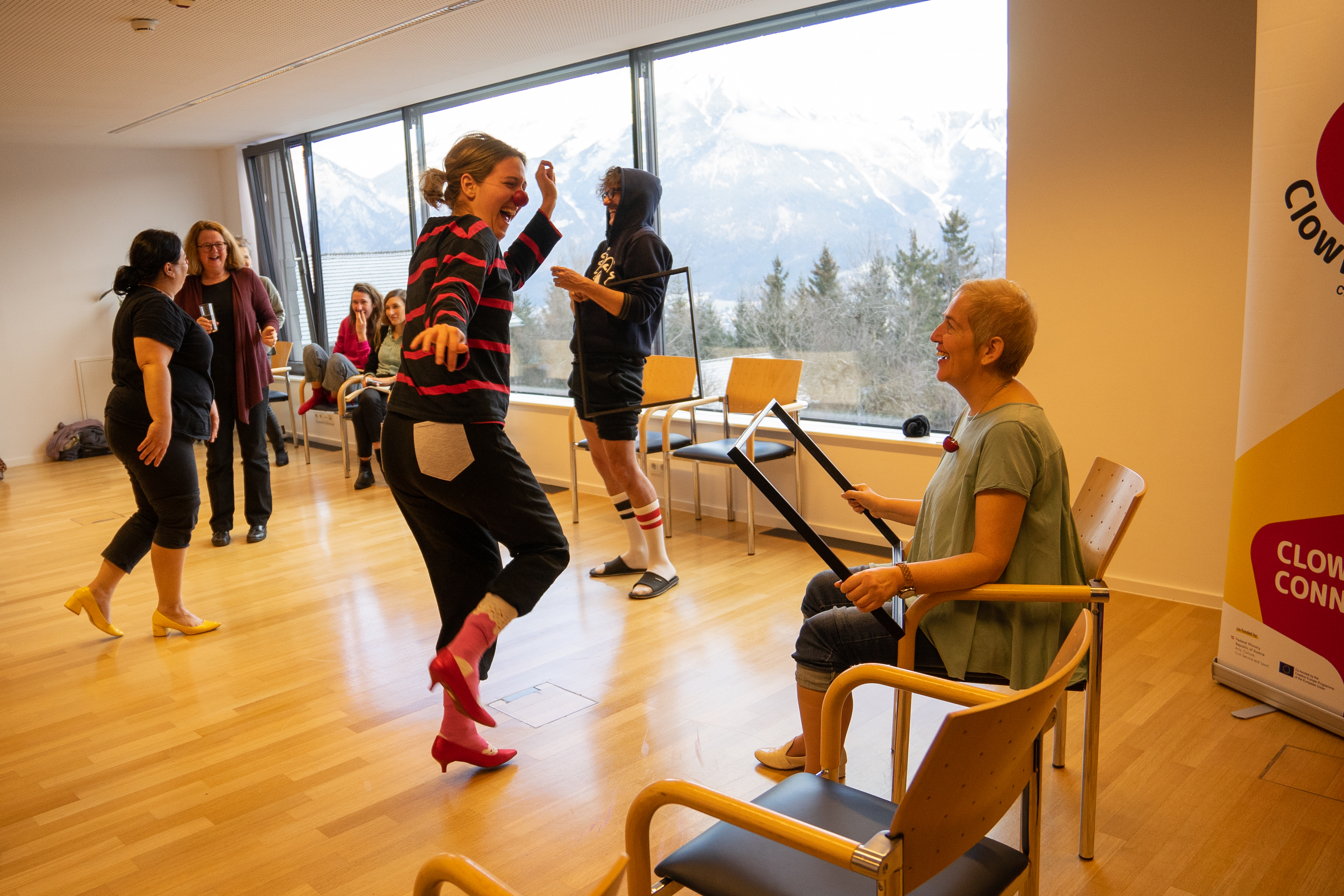 ROTE NASEN Clowns greifen in ihrer Arbeit auf fast 25 Jahre Erfahrung mit Senior*innen zurück. Dabei begegnen sie auch regelmäßig Menschen mit Demenz. Der Besuch bei Menschen mit einer demenziellen Erkrankung verlangt von den Gesundheitsclowns besonders viel Feingefühl und eine ganz besondere Vorgehensweise. In dem dreijährigen EU-Projekt ClowNexus vertiefen und erforschen ROTE NASEN nun gemeinsam mit sieben weiteren Clown-Organisationen Zugänge zu dieser Personengruppe. Von 16. bis 20. Jänner 2023 fand dazu in Österreich (Tirol) die dritte internationale Forschungsklausur statt – unter anderem mit Magdalena Schamberger, einer Pionierin und Spezialistin im Feld der künstlerischen Arbeit mit Menschen mit Demenz.