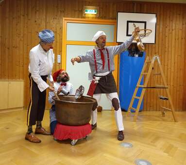 Bei dem Stück "Karawanen Küche" kommen die Clowns mit einem großen Kessel zu den Kindern. Das Thema ist gemeinsam lustbetont kochen, kosten, riechen und zubereiten. Die Clowns geben den sinnlichen Begegnungen mit den Kindern wieder großen Raum.