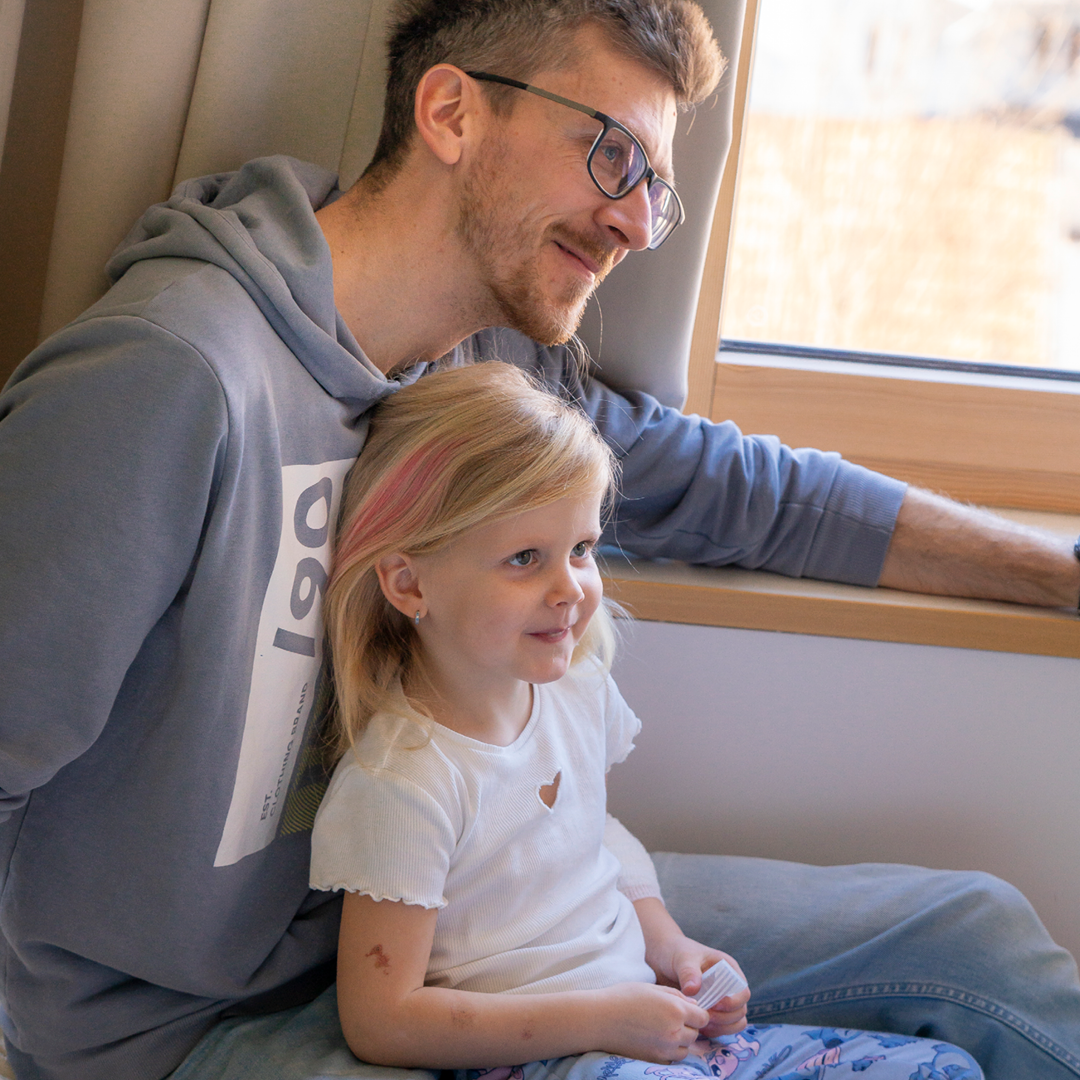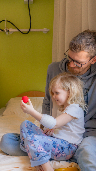 Laila sitzt auf ihrem Bett und kuschelt sich zurückhaltend an ihren Papa. Nach einer überstandenen Grippe hat sich die Infektion in ihrem Fuß festgesetzt. Durch eine Kanüle in ihrer Vene bekommt sie seitdem regelmäßige Infusionen. Das Durchspülen der Kanüle tut dem tapferen Mädchen immer wieder weh.
