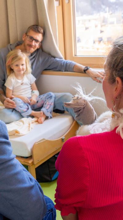 Handpuppe Peppi ist viel zu laut! Als die Clowns gemeinsam mit Laila und ihrem Papa musizieren möchten, krächzt er immer wieder dazwischen. Genug ist genug. Laila hält ihm sanft den Schnabel zu. Sie lächelt. Endlich Ruhe! Nun hat nach der langen Zeit hier im Spital sie einmal wieder die Kontrolle über das Geschehen.