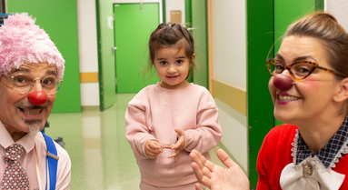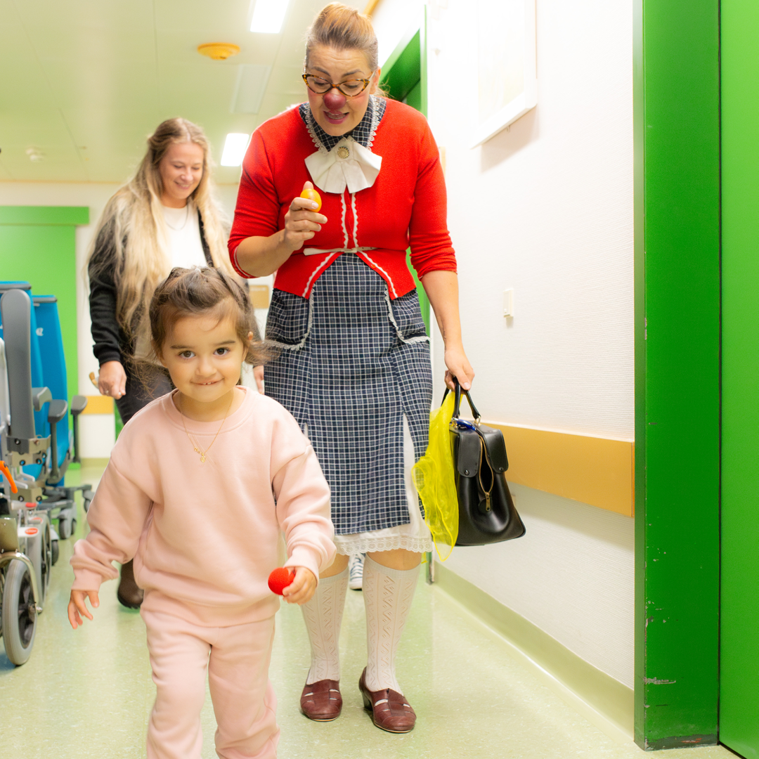 Dann läuft sie den Clowns freudestrahlend und lachend voraus, als sie weiter mit Musik durch die Ambulanz gehen. Das Lachen des kleinen Mädchens ist ansteckend und die allgemeine Stimmung bessert sich spürbar.