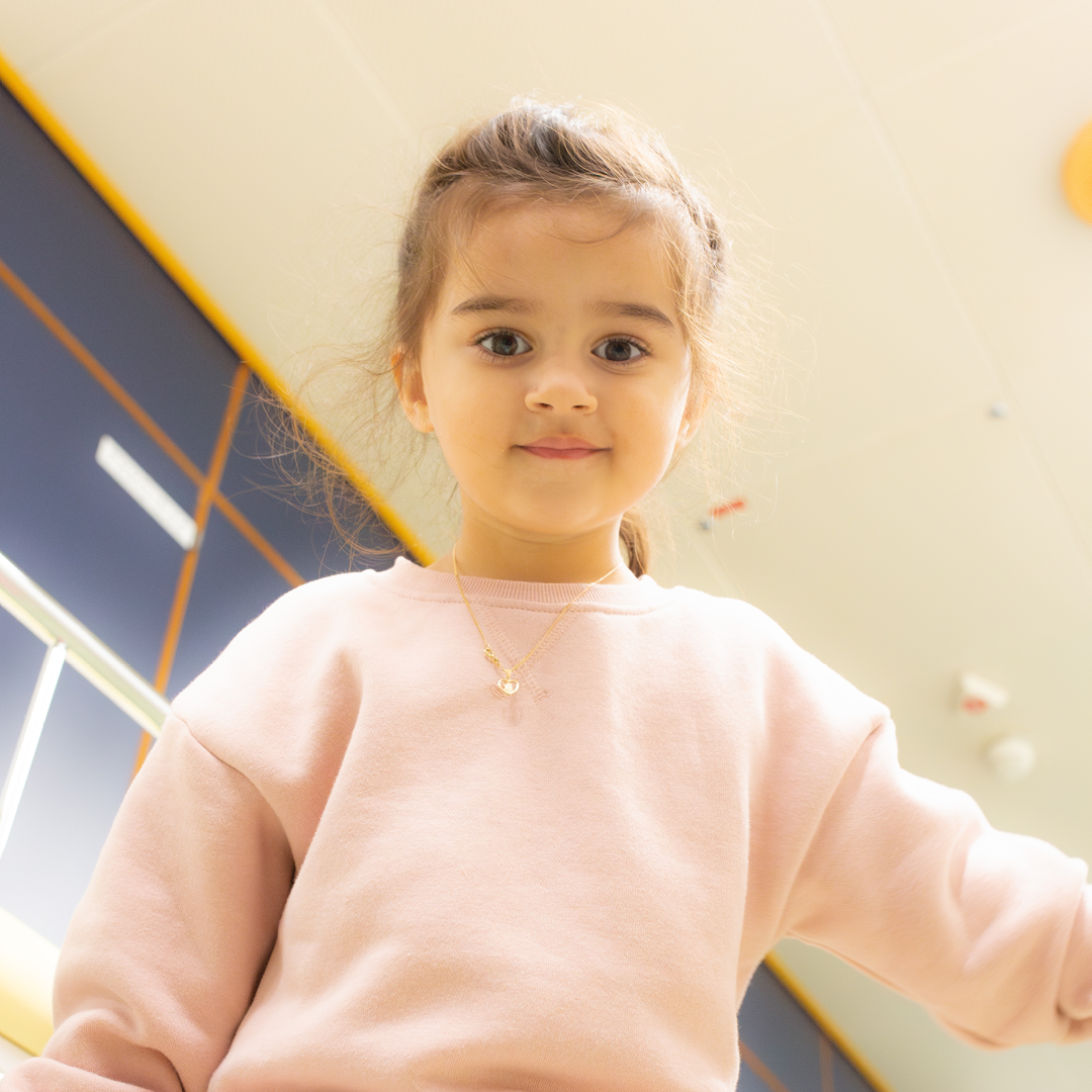 Clown Anton bleibt abrupt stehen und Clownin Hildegard läuft fast in ihn hinein. Vor ihnen steht ein kleines Mädchen in einem rosa Jogginganzug. Helena ist vier Jahre alt.