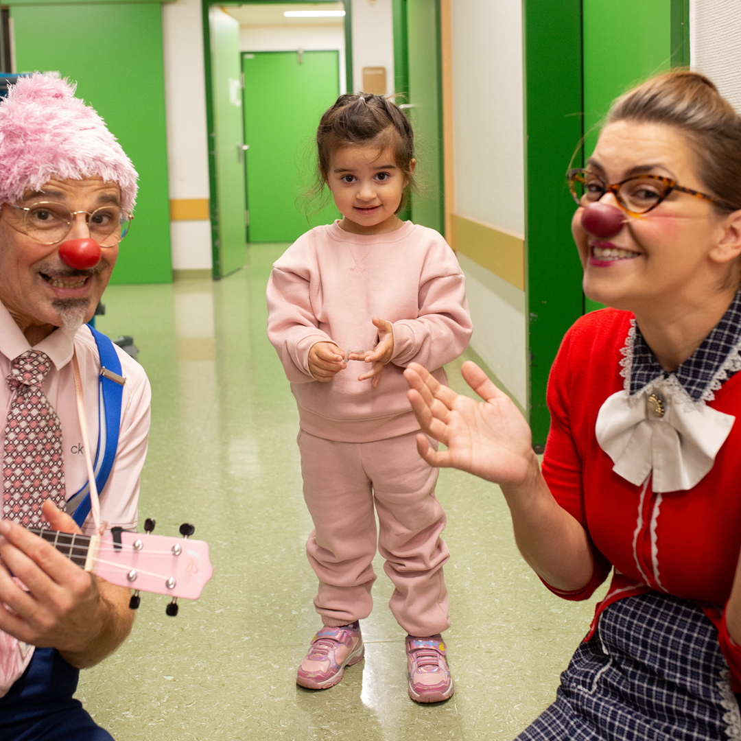 ruft Clownin Hildegard fröhlich, als sie gemeinsam mit Clown Anton und schwungvoller Musik den engen Gang der Ambulanz entlang geht. Die wartenden Patient*innen schauen ihnen lächelnd nach.
