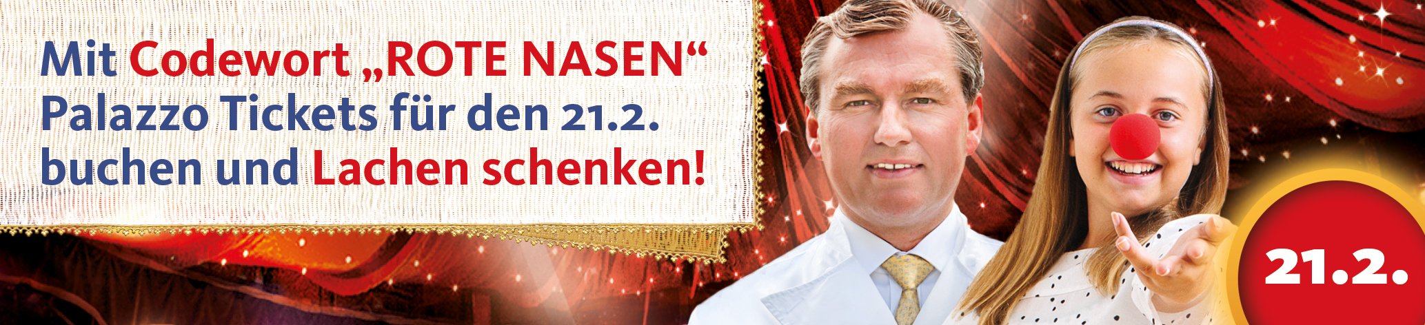 Wir verraten Ihnen ein Geheimnis: Wenn Sie Ihr Ticket für die fantastische Palazzo Show am 21.2.2018 mit dem Codewort ROTE NASEN buchen, können Sie Lachen schenken – denn diese Ticketerlöse kommen ROTE NASEN zugute! Als kleines Dankeschön gibt es vor Ort einen gratis Begrüßungssekt und Sie können sich an einem ROTE NASEN Infostand über unsere Projekte informieren.