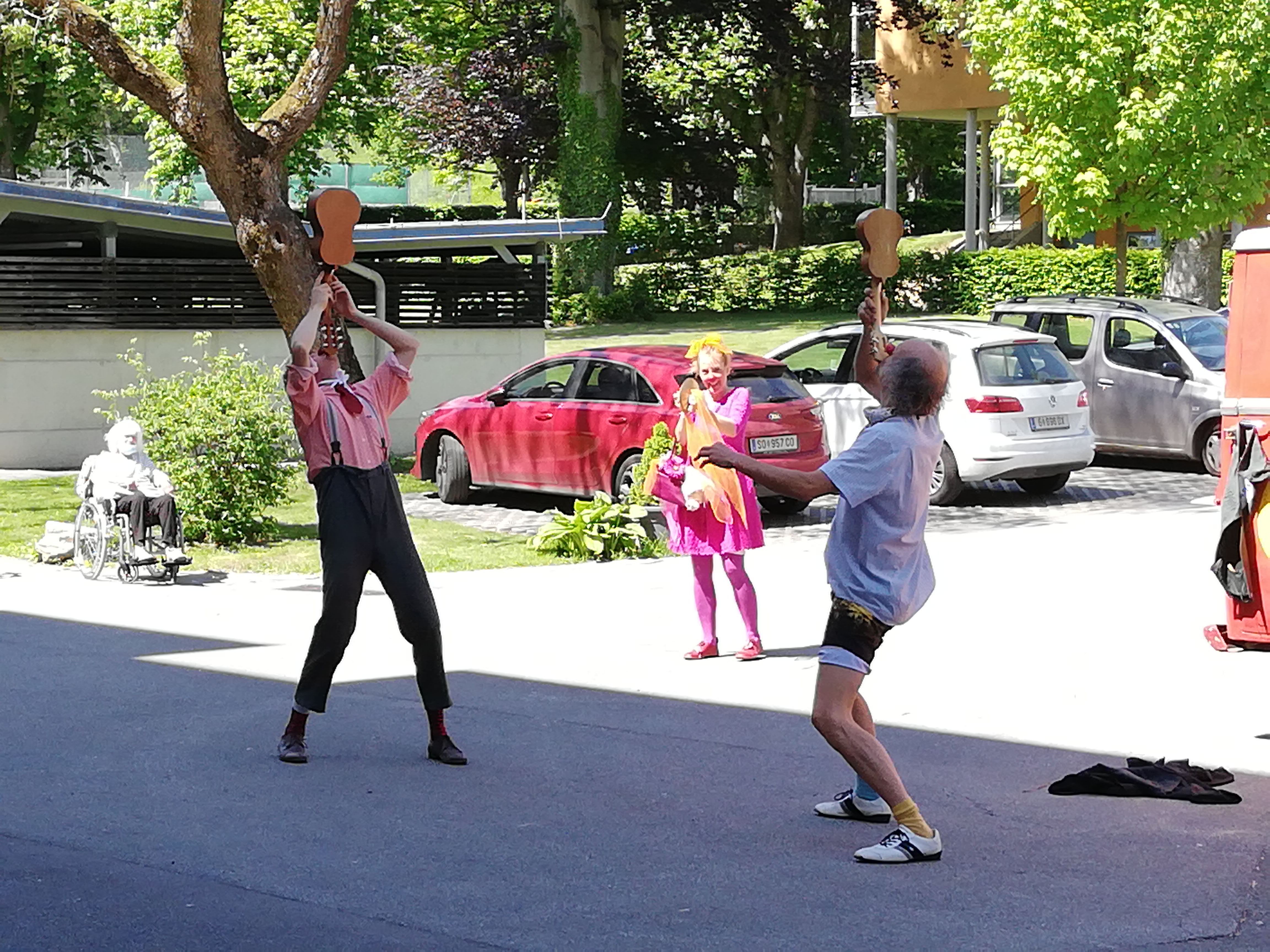 Lotte läßt die Oceandrum rauschen. Jetzt heißt es Augen schließen und genießen: Möwen kreischen und batzeln auf Leute herunter, eine frische Brise bläst (Fächer fächeln), Sandspielzeug liegt herum, eine Idylle. Dann schreiben wir unsere Message in den Sand. Wir legen riesige Buchstaben mit bunten Bändern in das Gras: L O V E . Ein Flugzeug fliegt drüber, wir winken und weisen auf unsere Botschaft hin! Zwei Betreuerinnen bzw. Animateurinnen gehen mit vier Patientn*innen zu einem nahe gelegenen Platz zum Turnen.