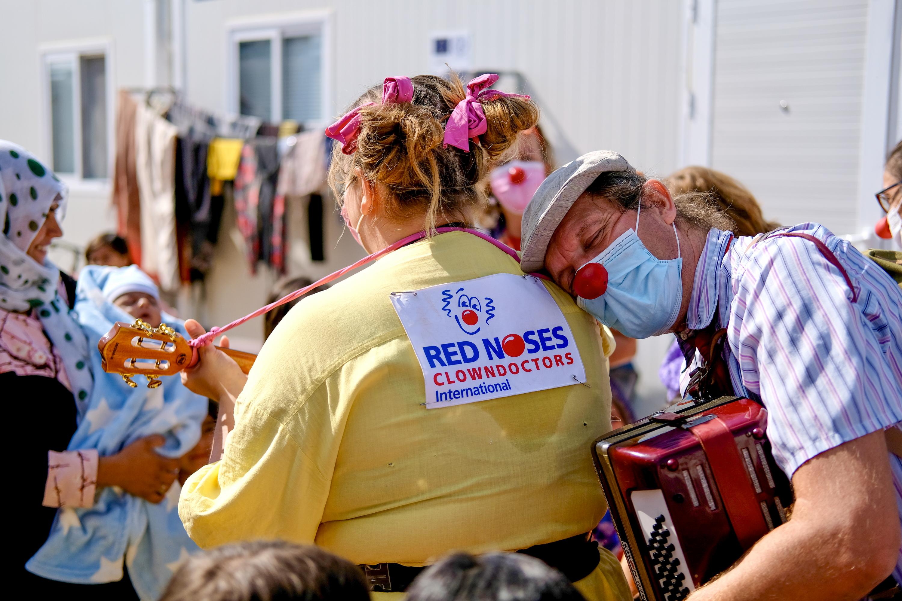 Wo Hilfsorganisationen Erste Hilfe im medizinischen und sozialen Bereich leisten, kümmern sich ROTE NASEN Clowns um die Erste Hilfe für die Seele. Den allerersten Einsatz für Flüchtlinge leisteten ROTE NASEN Clowns recht kurzfristig 1999 während des Kosovo-Kriegs. Seit mehr als acht Jahren tun sie dies im Rahmen von ROTE NASEN International regelmäßig in unterschiedlichen Ländern. So haben Clowns aus Österreich gemeinsam mit Clowns aus internationalen Partnerorganisationen geflüchtete Menschen in Südsudan, dem Kamerun und auf Lesbos in Griechenland besucht.
