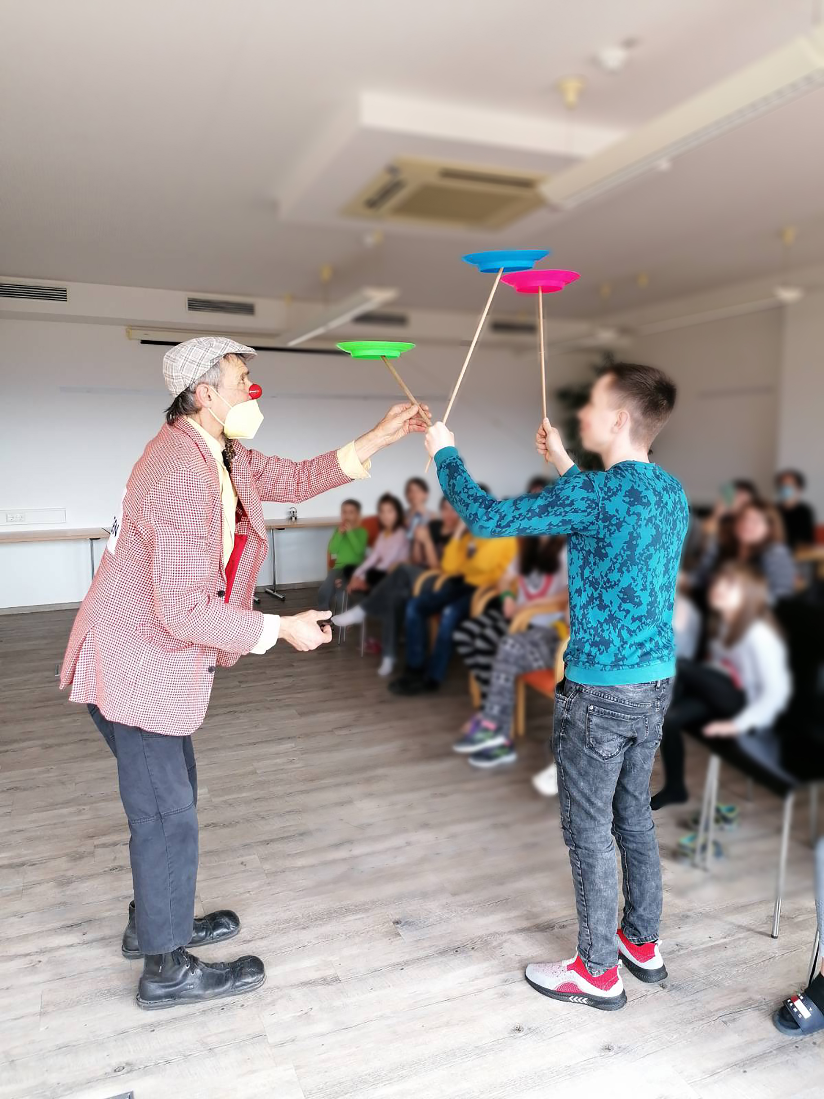 Die Clowns der ROTE NASEN besuchen geflüchtete Kinder aus der Ukraine.