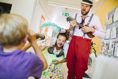 Dabei gibt es bei den Kindern und Jugendlichen auf psychiatrischen und psychosomatischen Stationen einen wesentlichen Unterschied zu jenen auf anderen medizinischen Abteilungen: Viele werden aufgrund ihrer besonderen Lebensumstände nicht besucht. Gleichzeitig verbringen die meisten mehrere Monate, manche sogar Jahre, hier. Die ROTE NASEN Clowns werden so zu wichtigen Bezugspersonen, auf deren Besuche sie sich verlassen können. Wenn ROTE NASEN diese Kinder wöchentlich sehen, entsteht eine Nähe zu den Clowns. „Oft fühlen sich die Patient*innen aufgrund einer psychischen Erkrankung extrem unsicher. Dieses Wissen bauen wir in unser Clownspiel ein: Wiederholungen und Running Gags geben den Kleinerein wie auch den Größeren Halt. Wir entwickeln aufbauende Geschichten und machen die Kinder zu Expert*innen. Durch die Übergabe vor dem Besuch kennen wir die Vorlieben der Kinder und Jugendlichen, die wir ebenfalls berücksichtigen“, erzählt Barbara Thonhauser alias Clownin Lotte.