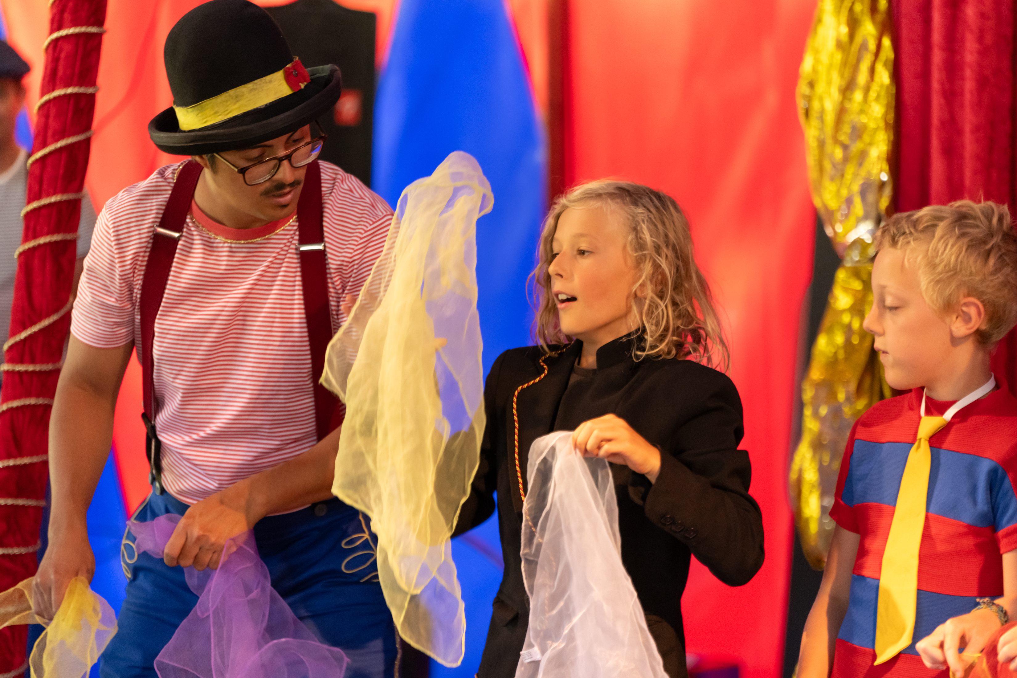 Dann werden unseren zukünftigen Artist*innen die unterschiedlichen Disziplinen, wie Jonglage, Flowersticks, Diabolo, Akrobatik, Seiltanz, Zauberei und vieles mehr vorgestellt und sie dürfen sie auch selbst ausprobieren. Dabei arbeiten wir in Gruppen und auch mit den einzelnen Kindern. Nach und nach mischen sich die Kinder untereinander und bilden Teams, die an einem Kunststück arbeiten.