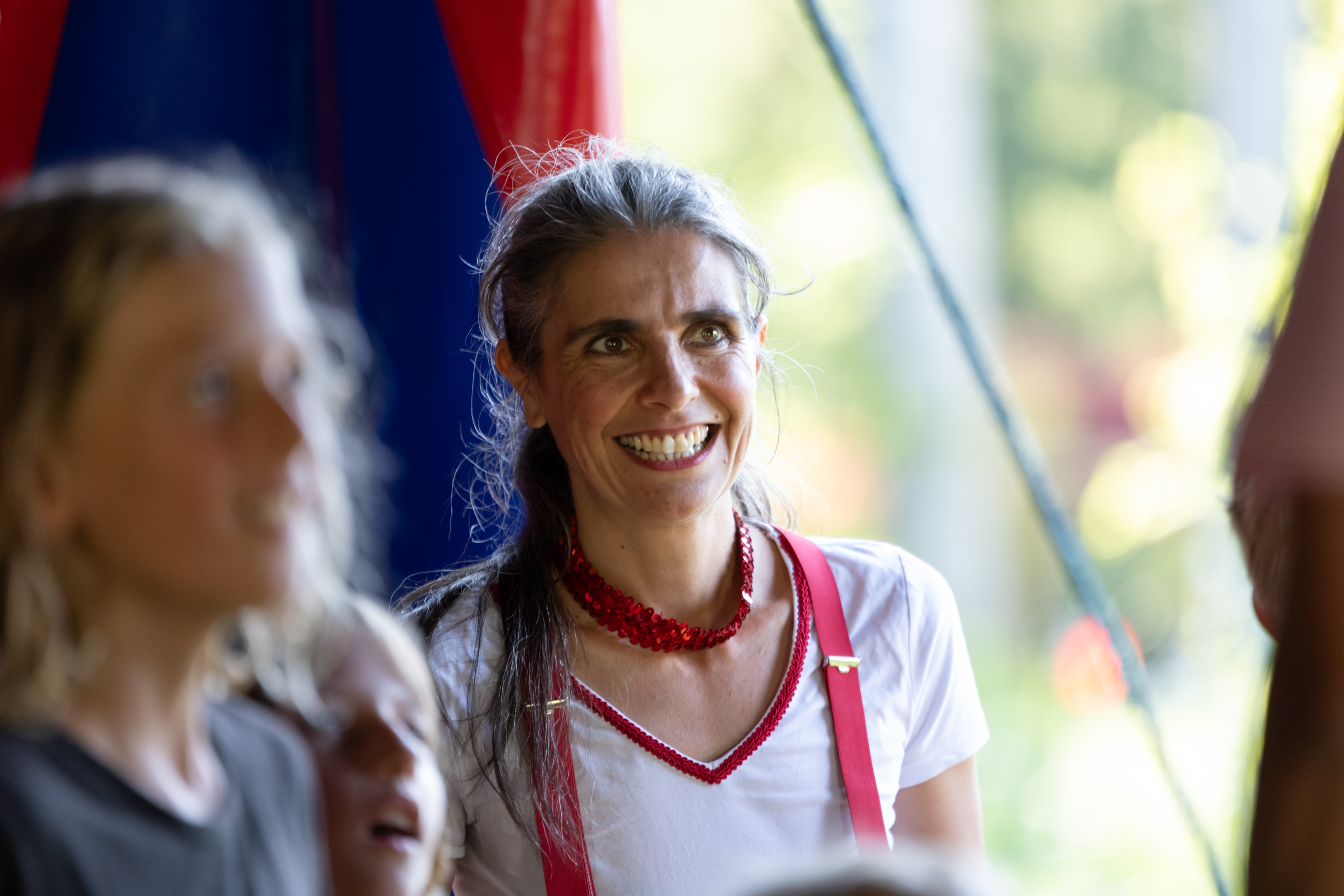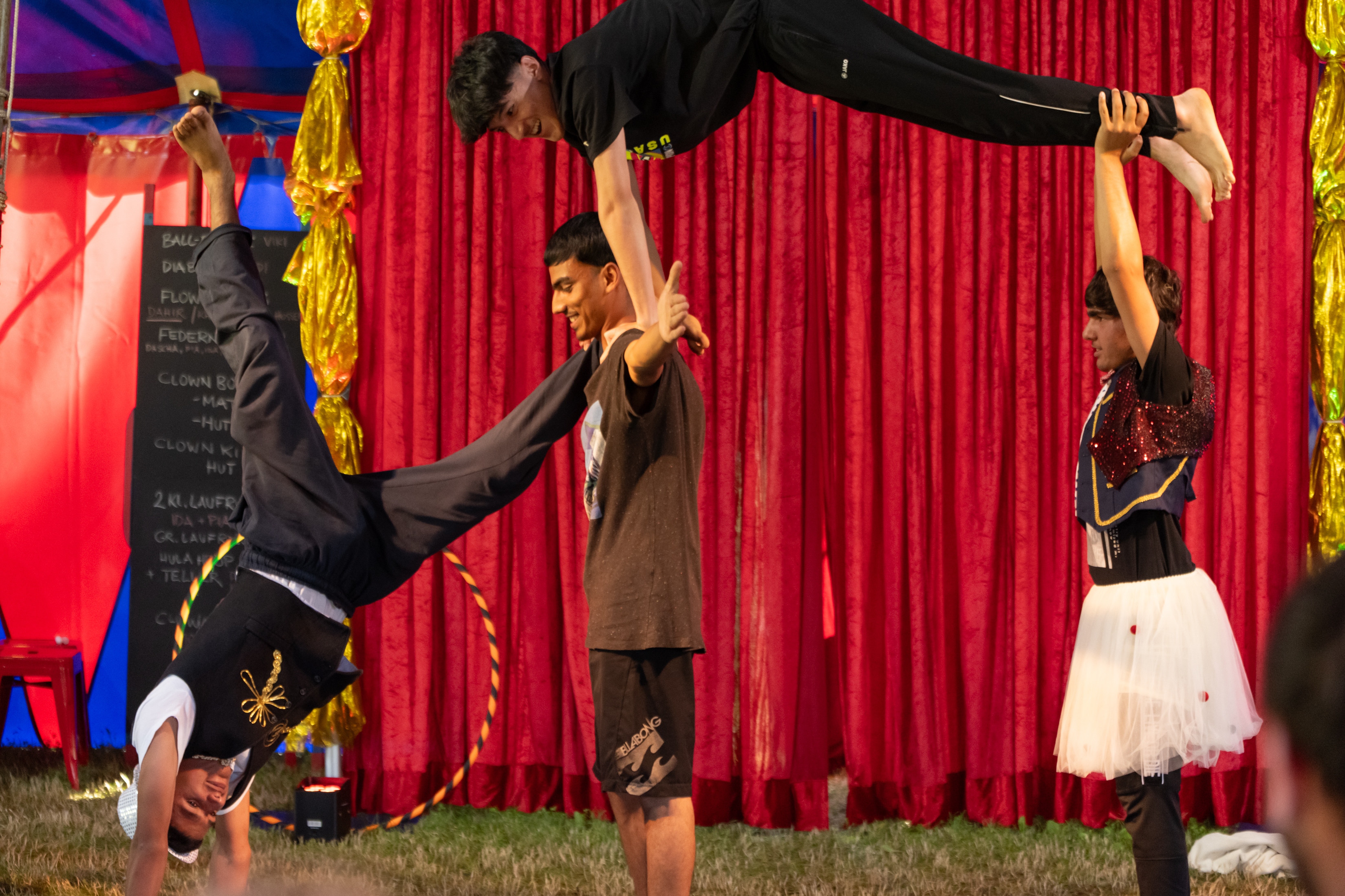 Fünf Tage lang bieten wir für maximal 30 Kinder und Jugendliche einen Workshop an, der am letzten Tag mit einer großen Vorstellung für geladene Gäste seinen Höhepunkt findet. Wir beginnen die Woche mit einer kleinen Show, die das Zirkusteam für die Teilnehmer*innen zum Besten gibt, damit sie ein Bild davon bekommen, was sie in dieser Woche erwartet. Einige Kinder waren noch nie in einem Zirkus.