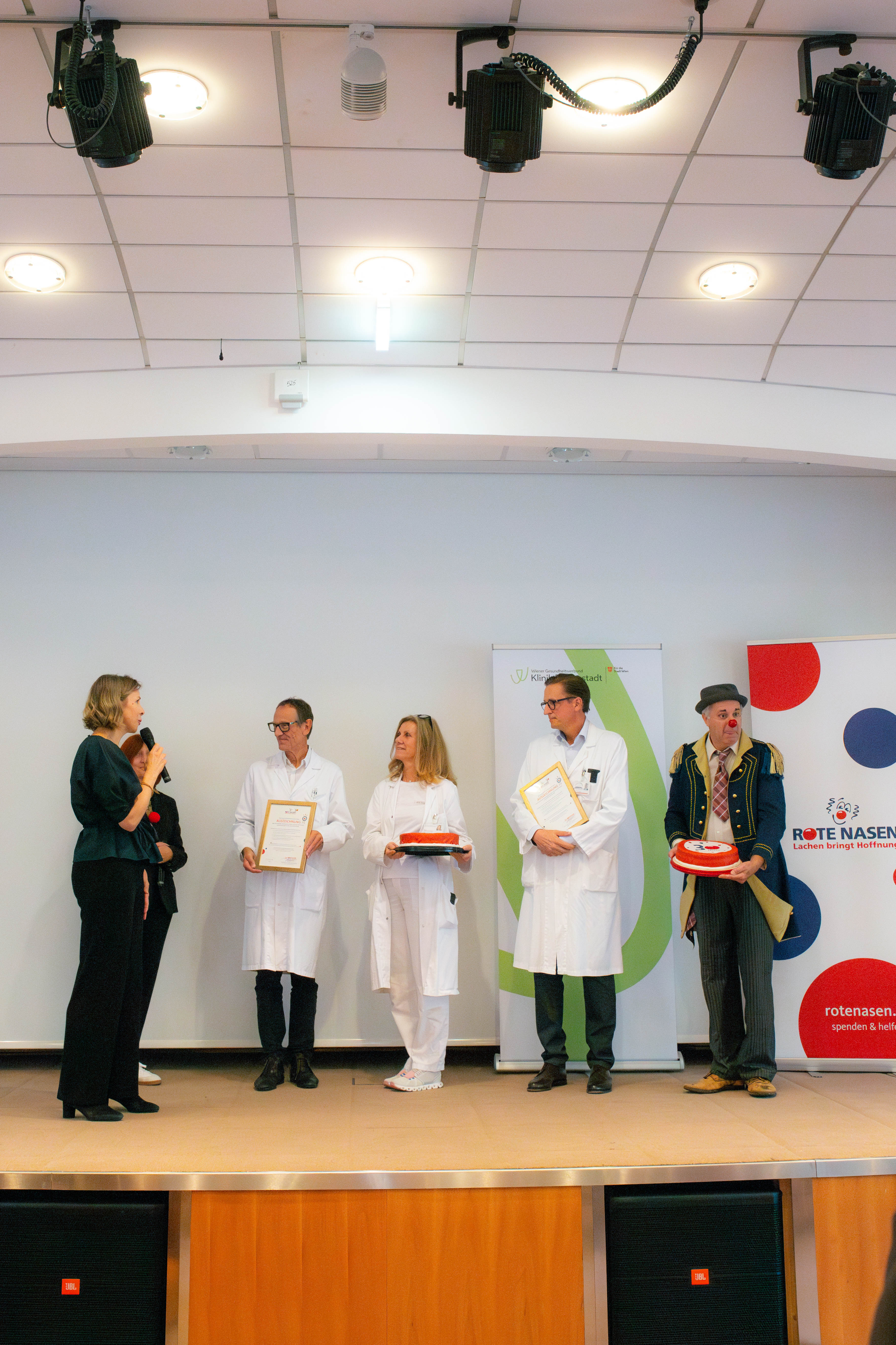 Im Zuge der Jubiläumsfeier zeichnete ROTE NASEN die Abteilungen für Kinder- und Jugendchirurgie und für Kinder- und Jugendheilkunde der Klinik Donaustadt als Paradebeispiel für eine langjährige, wertschätzende und professionelle Zusammenarbeit und die hervorragende Integration von ROTE NASEN Clowns in den Stationsalltag aus.