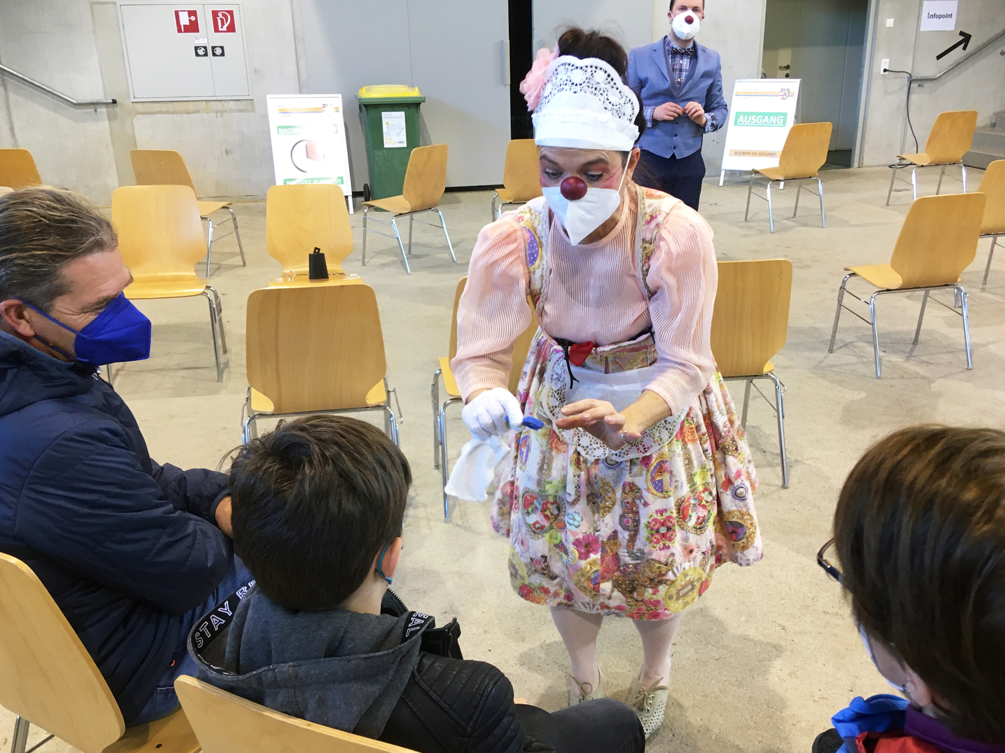 Alle drei Wochen am Donnerstag gibt es in der RGO- Arena Lienz eigene Covid-Impftermine für Kinder und Jugendliche. Damit ihnen die Impfung so angenehm wie möglich gemacht wird, sorgen ROTE NASEN Clowns vor Ort für lustige Stimmung und eine entspannte Atmosphäre. Schon die Wartezeit wird mit Liedern oder Zaubertricks verkürzt. Auf Wunsch begleiten die Clowns die Kinder dann bis zur Impfung und schaffen es oft, dass Ängste weniger werden und die Impfung rasch und vielleicht sogar mit einem Lächeln beendet werden kann.