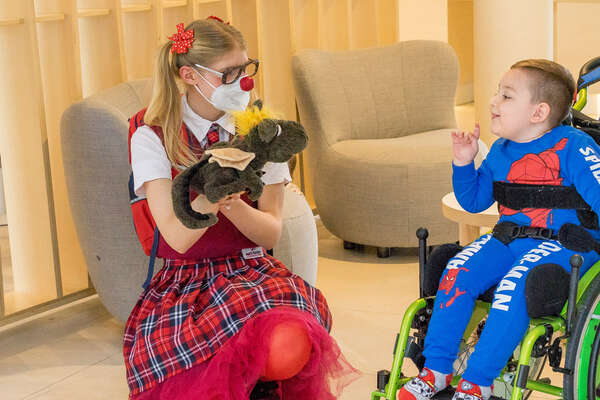 ROTE NASEN-Clownin Josefine mit Stofftier in der Hand und ein kleiner Junge in seinem Rollstuhl.